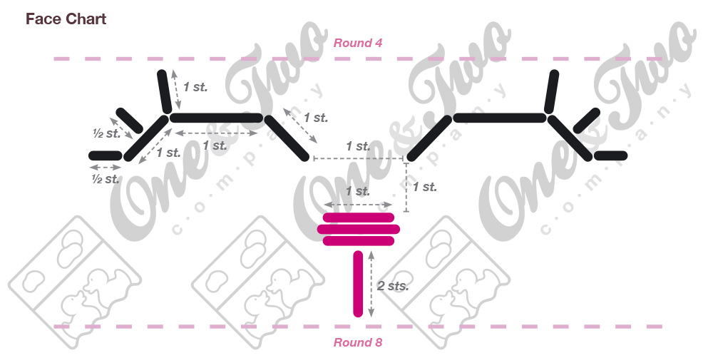 Now you must look at the chart below to know how to make Bunny Face. You will need Black and Pink yarns.