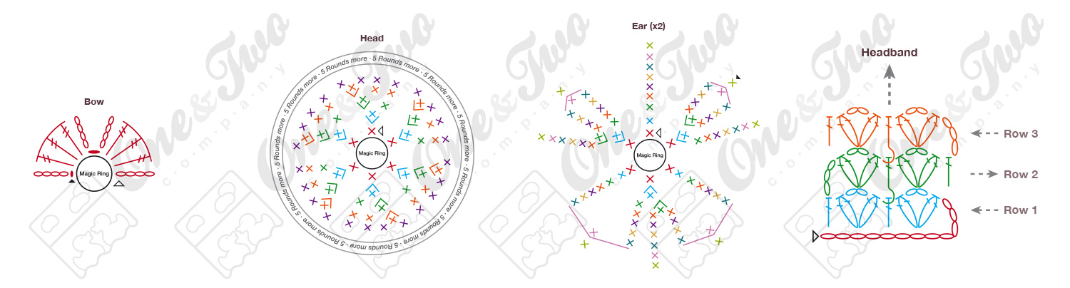 With Fuchsia sew the Bow to the head. Place it centered between the two ears. Fasten off.